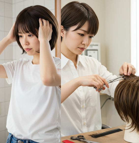 ・もう一度、前髪や全体のバランス、毛量などを調節して、元のヘアスタイル再現